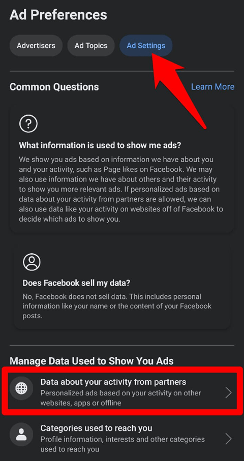 4- اکنون “تنظیمات تبلیغ” را انتخاب کنید و روی “دادههای مربوط به فعالیت های شرکا” ضربه بزنید.